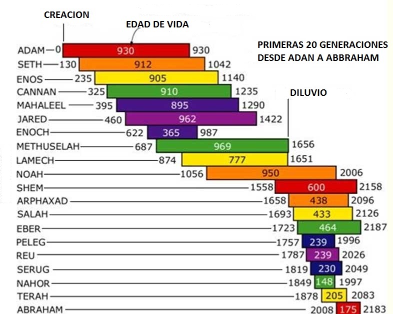 En este grafico usted puede observar, que por ejemplo, que Noe nació en el año 1056, y Adán murió en el año 930, o sea 126 años antes que naciera Noe. Pero observe que el Padre de Noe (Lamec) nació en el año 874, esto quiere decir que cuando Adán murió Lamec el Padre de Noe tenía 56 años. Por qué no podemos pensar que en esos 56 años cuantas veces Lamec se encontró con Adán, y no solo con Adam, sino con Set, Enos, Canan, Majarel, Jared, Enoc, y Matusalem su padre. Podríamos imaginar cuantas veces estuvieron todos juntos (como lo hace cualquier familia) en algún Shabat (Dia de Reposo) hablando y contando Adán la historia desde el inicio. Como pudo Moisés saber las cosas para escribir todo esto e la Torá (Pentateuco), aparte la ayuda del Espíritu Santo que lo inspiro.
