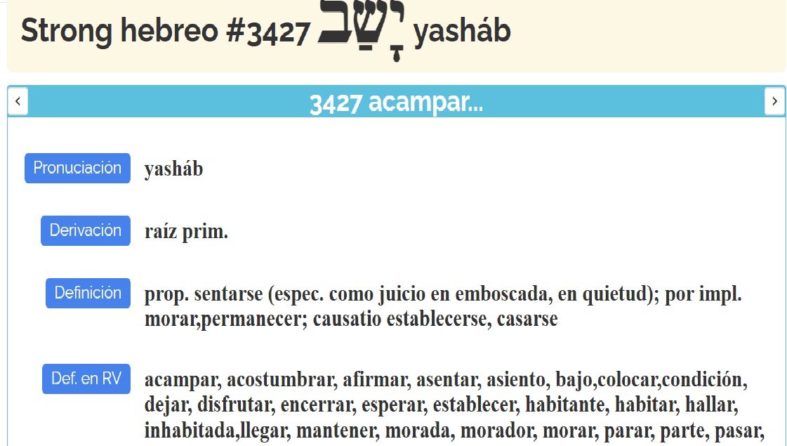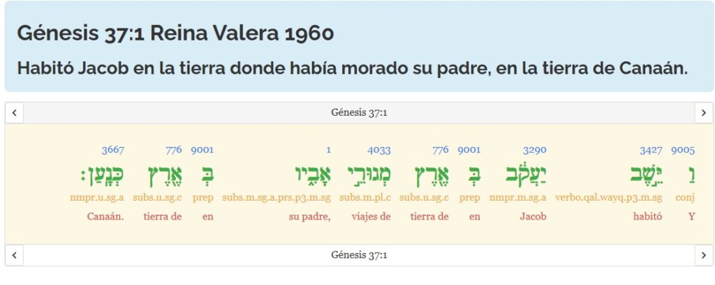 Capítulo 37: Como vemos abajo en el texto hebreo original la palabra «y habitó» es el strong 3427 o sea que en hebreo es la raíz «Yashab» que es sentarse, quietud, reposo entre otras palabras parecidas, tiene que ver con el verbo «Shuv» que es retornar, o sea que de alguna manera Jacob, ahora Israel, Retornó a la Voluntad de YHWH y podía estar en reposo su vida, porque encontró como vivir de acuerdo a la Obediencia, ya sin aplicar sus fuerzas al cumplimiento, sino en tranquilidad y espera delante de El.